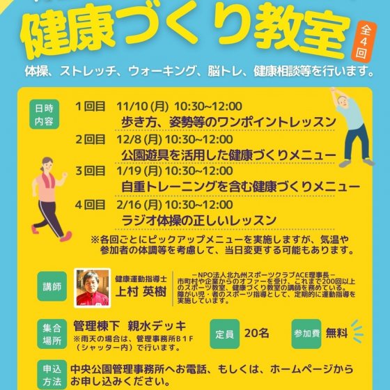 11月10日(月)、12/8 (月)、1/19 (月)、2/16 (月)健康づくり教室を開催します!