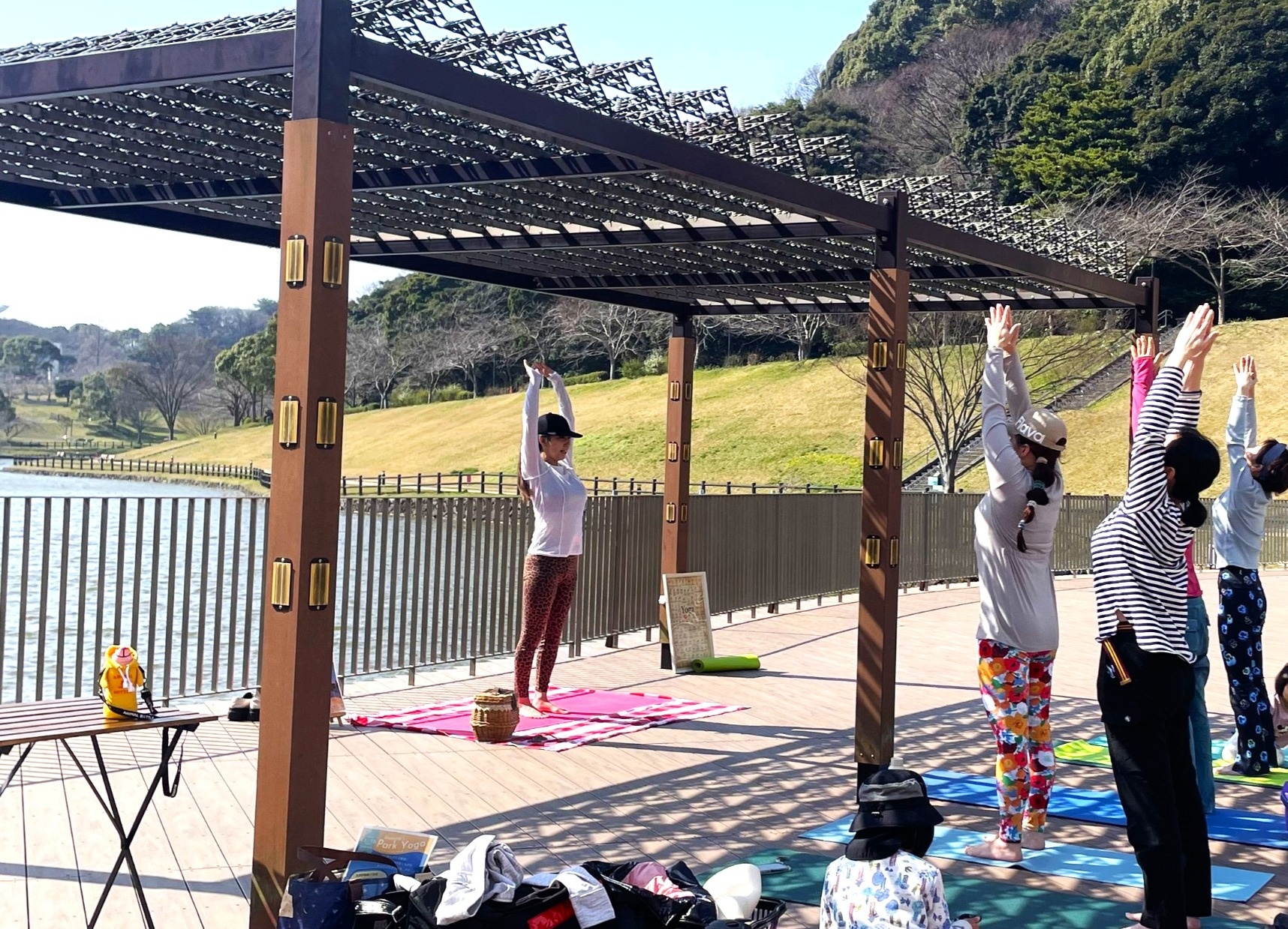 持ち物: ヨガマット or バスタオル(ヨガマット貸出可 ※数に限りがあります)、飲み物、タオル、帽子、レジャーシート(ヨガマットの汚れ防止用)