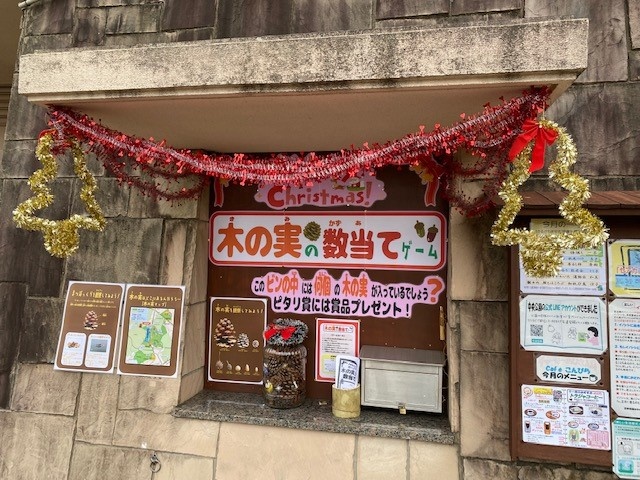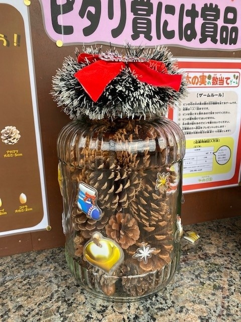 親水デッキにある瓶の中に入った木の実の数を考えて当てるゲームです。