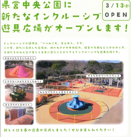 新しく計5基の遊具が完成しました♪ インクル―シブの語源は、「つつみこむ、支えあう」です。 この度、新たに完成した広場は、体の大きさや身体能力、障害の有無などにかかわらず、子供たちがみんなで楽しく安全に遊ぶことができるインクル―シブな遊具広場です。